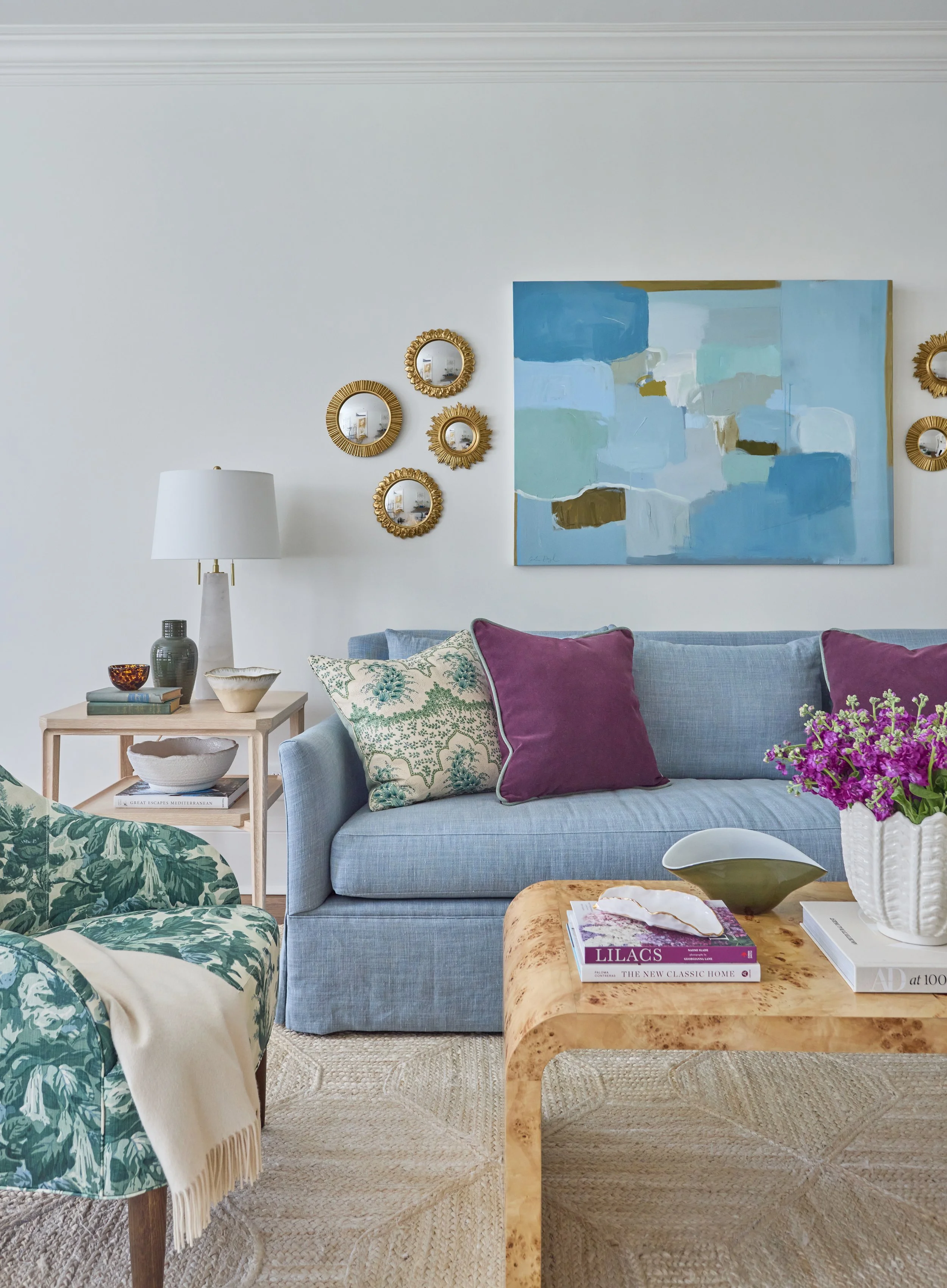 A living room with a light blue sofa, purple pillows, a wooden coffee table with books and a vase of purple flowers, a patterned armchair with a beige throw, a side table with decorative vases and a lamp, matching wall art and mirrors.